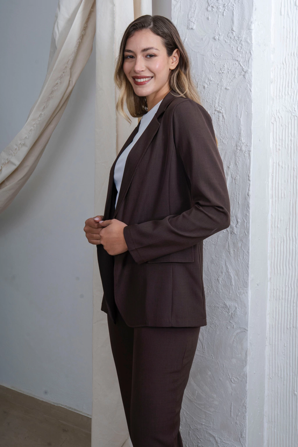 Blazer confeccionado en un tejido sastrero asargado con tapa bolsillos y solapa. Es un genero con mucha caida y tacto suave.