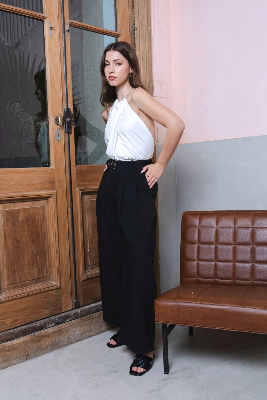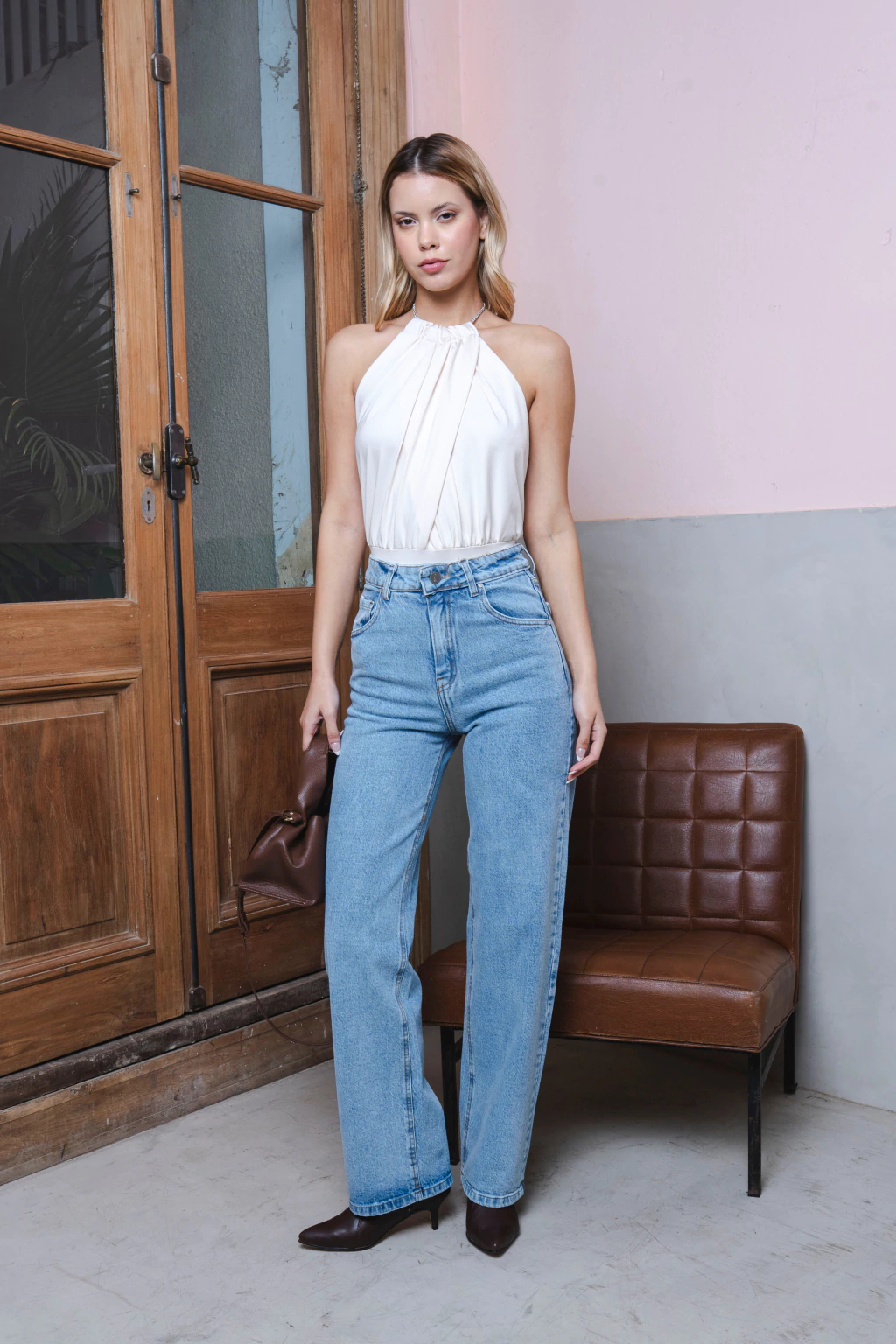 Body de microfibra elastizada premium. el frente es cruzado y fruncido, sumando sosten y un foco de atencion. Ademas como detalle a destacar, lleva cordon de strass en el cuello con ajuste en la espalda. Acentua y modela la cintura con un pequeño elastico en la espalda.