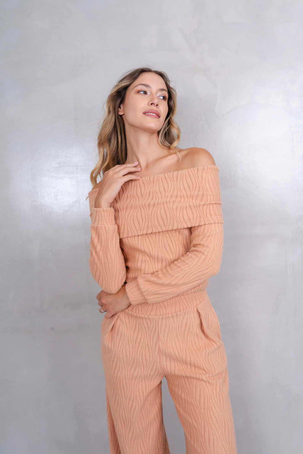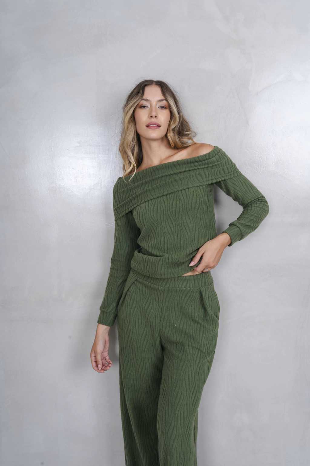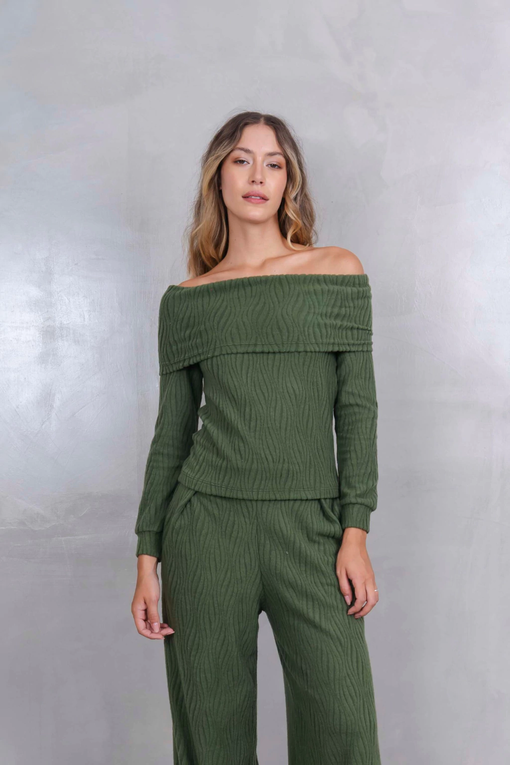 Buzo off shoulder con cuello volcado bote, con puño en las mangas y largo modular hasta la cadera.