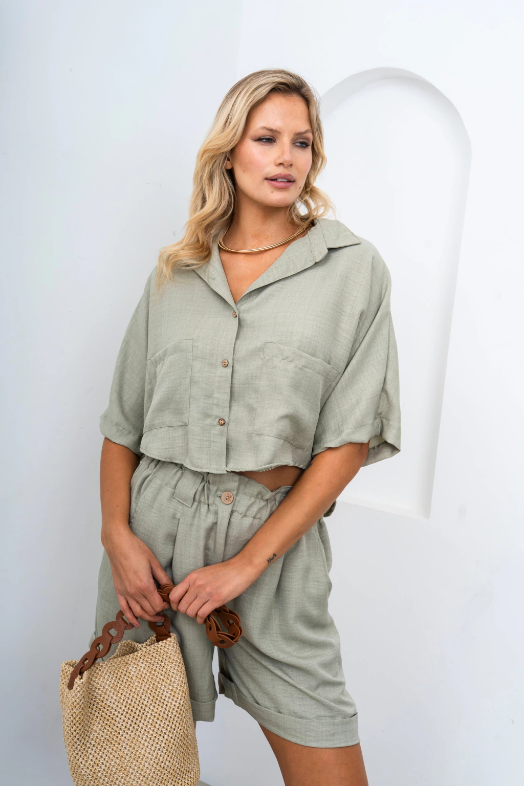 Camisa de lino vintage, con bolsillos plaque en el frente y molderia oversize.