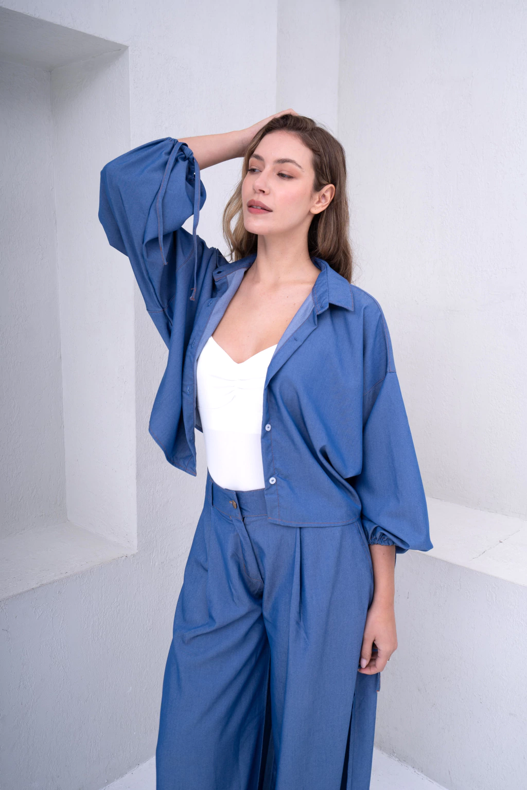 Camisa confeccinada en simil jean. Con puños ajustables y molderia oversize.