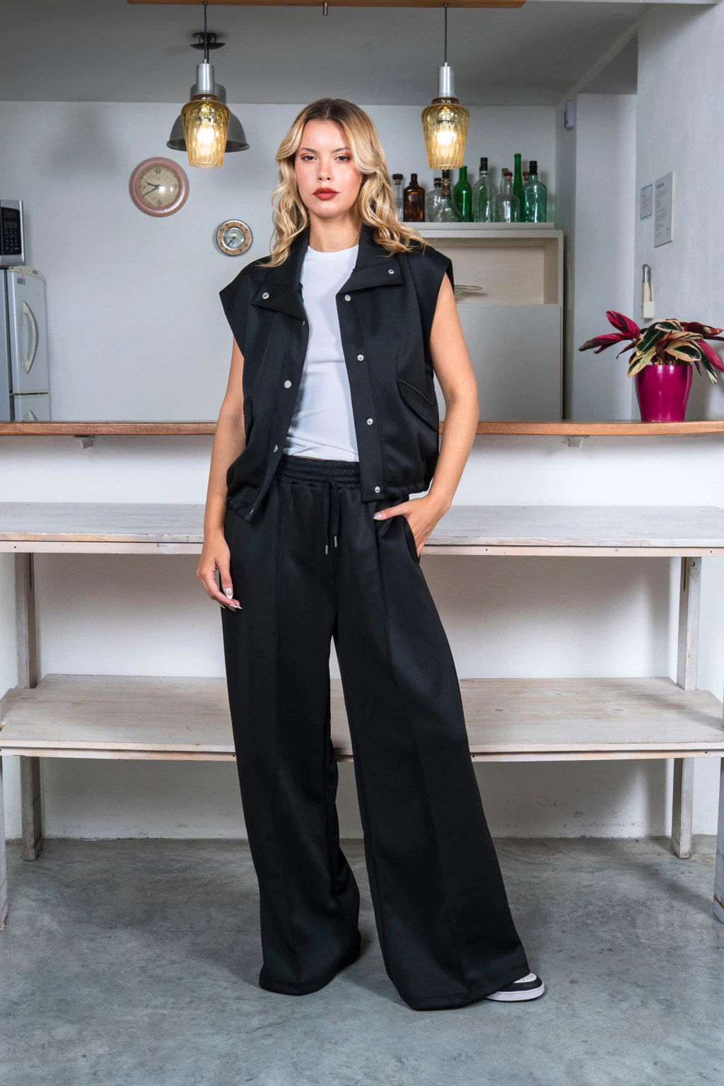 Chaleco oversize confeccionado en scuba microfibra con lycra. Un tejido super elastizado, suave y soft en el interior. Ademas lleva bolsillos internos con tapa de bolsillo, y en la cintura lleva cordon ajustable. La combinacion con los bolsillos metalicos le aporta diseño y estilo.