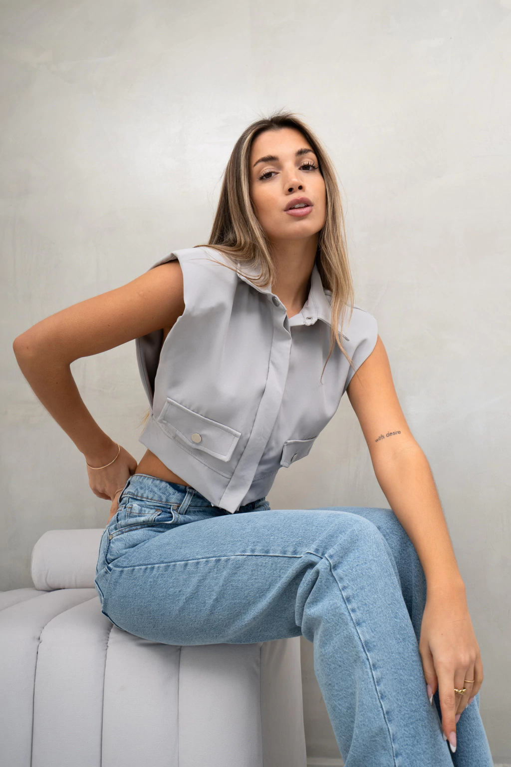 Es una pieza de diseño con maximos detalles como tapabolsillos en el frente con botones metalicos, hombros marcados y amplios y cintura entallada con recorte. Ademas lleva doble tapacartera en el centro y cuello camisero.