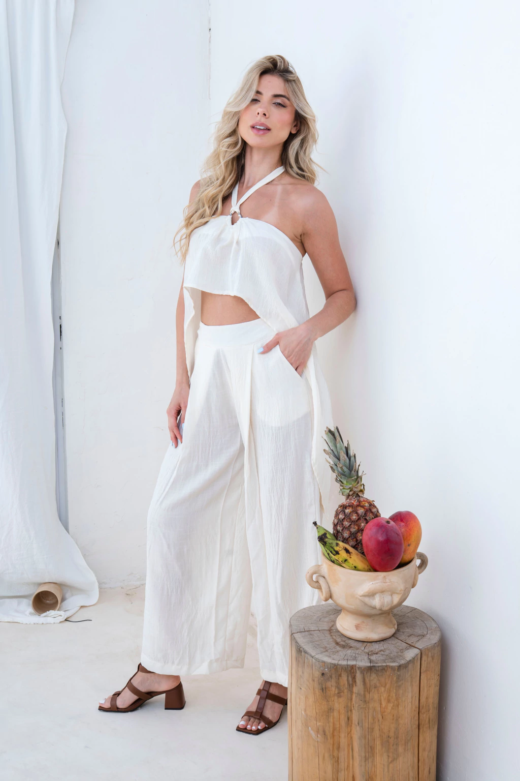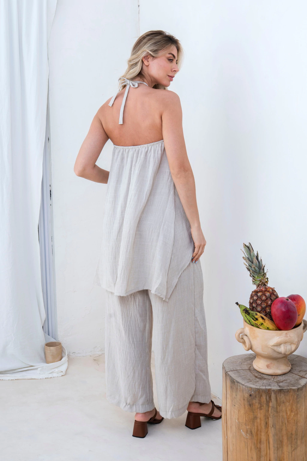 Palazzo con elastico en la esplada y tablas en el frente, confeccionado en lino gasa, con punto abierto.