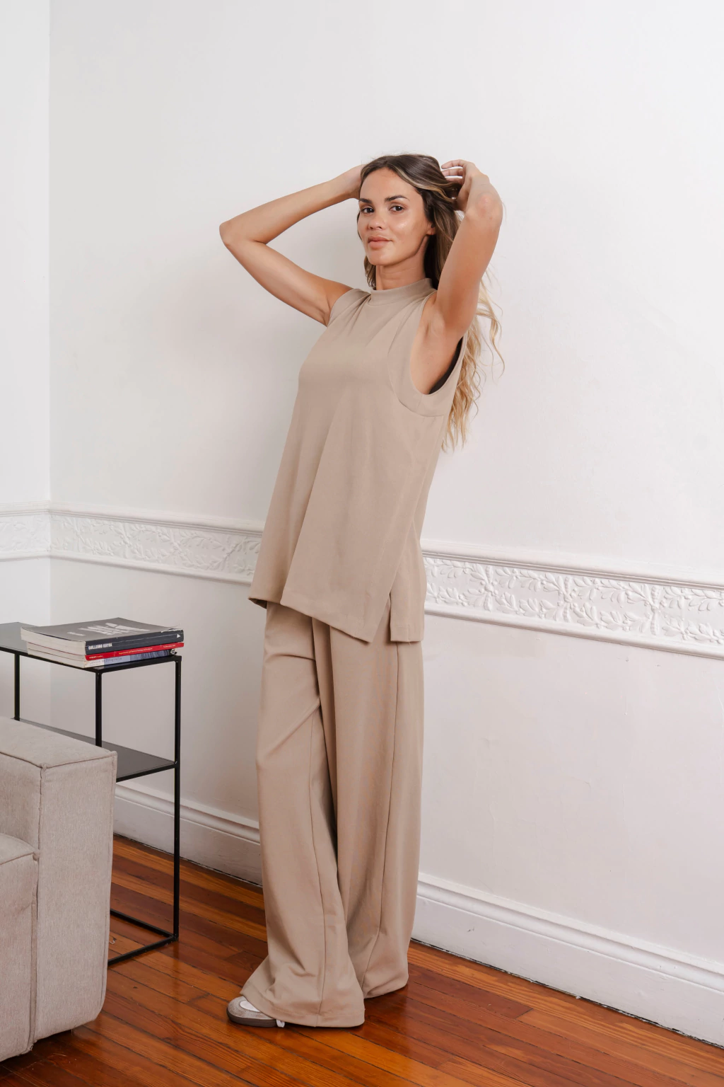 PANTALÓN GAIMAN: Descubre el palazzo de termopolar melange con cintura elastizada y delantero tableado. Su tacto suave y térmico lo hacen ideal para combinar con el Chaleco Natal.