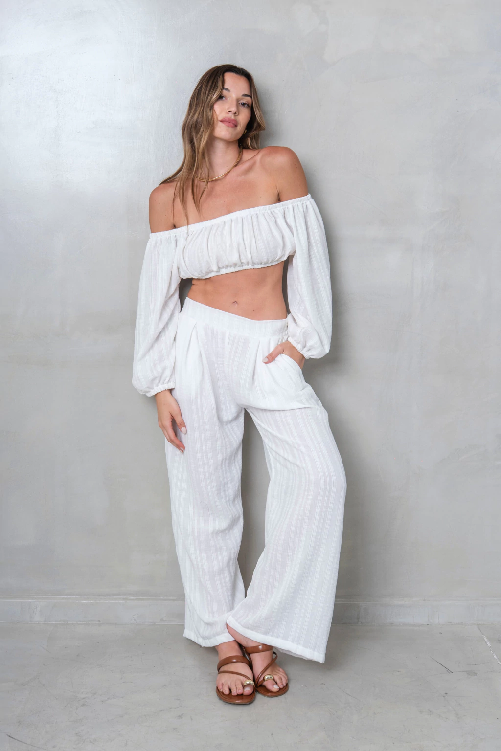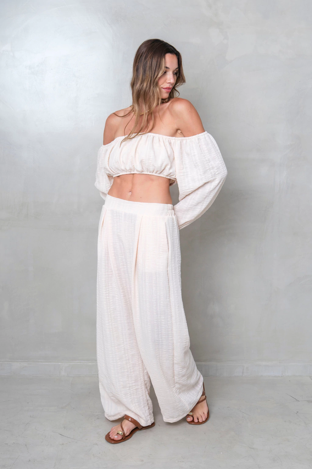 Pantalon de gasa bordada con cintura elastizada y bolsillos internos. Un palazzo amplio con mucha caida y movimiento.