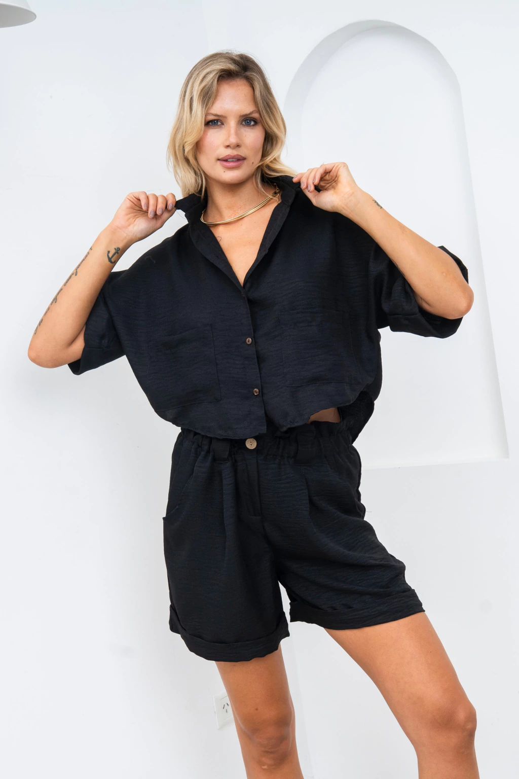 Short de lino vintage con cintura elastizada. Cintura alta con volante y boton amaderado combinando con el tono de la misma. Ademas lleva bolsillos internos y tablas en el frente.