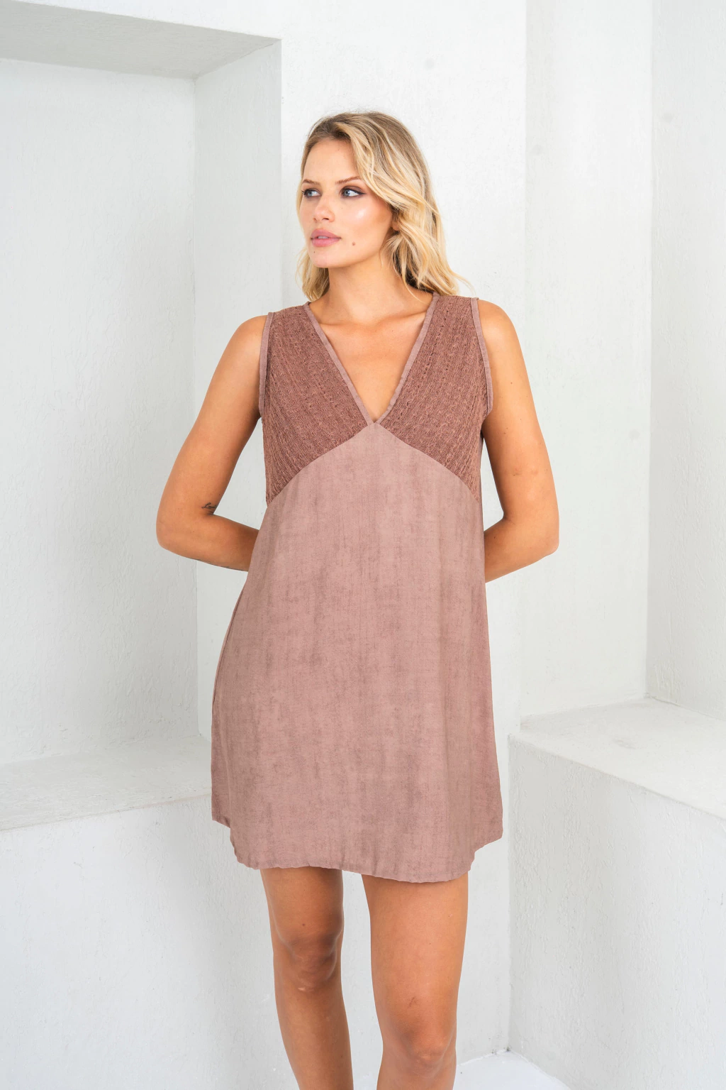 Vestido de lino vintage con tacto rugoso, combinado con crochet de hilo, suave y liviano. Estos dos generos combianan espectacular gracias a su color y su textura. Tiene un recorde en el bajo busto que estiliza la cintura y el escote en V resalta el busto, con un largo ideal!